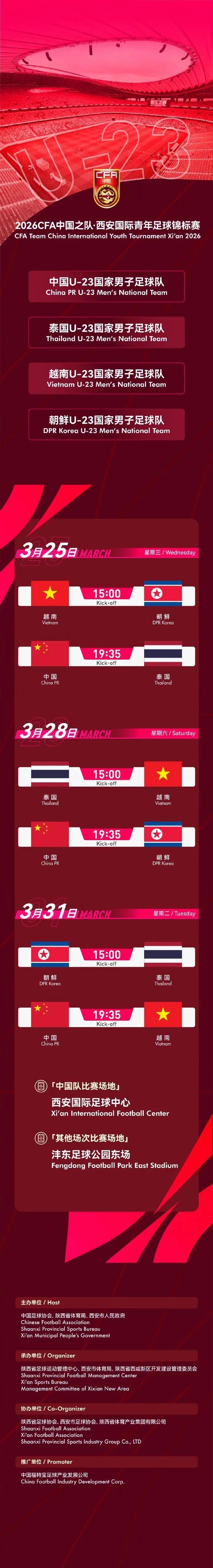 在等待陕西联合于西安国际足球中心登场期间,陕西球迷还有三场高水平的比赛可以观看:3月25日、28日和31日,在U23亚洲杯中获得亚军的中U23国家队将在此场地分别迎战泰国、朝鲜和越南的U23国家队。实际上,中U23国家队通往U23亚洲杯亚军之路正是从西安启程,即去年9月的U23亚洲杯预选赛,那也是西安国际足球中心的首次启用。