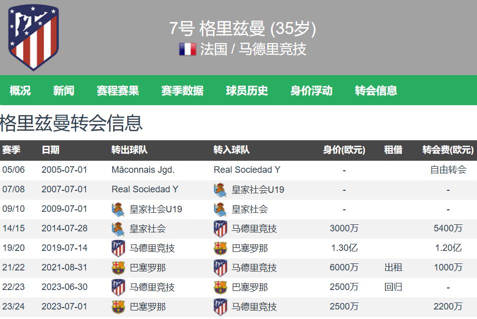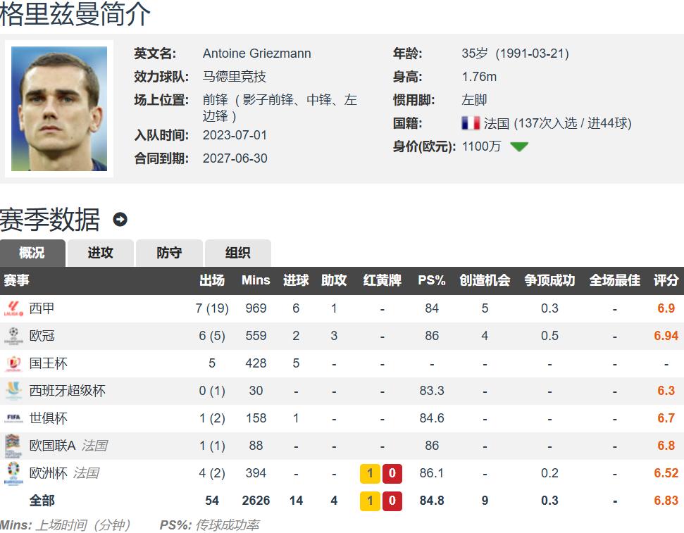 现年35岁的格列兹曼身高1.76米,是一名左脚球员,能够胜任前场多个位置。目前转会市场估价为1100万欧元,现有合同至2027年,税前年薪为938万欧元。格列兹曼将与马竞提前一年终止合同,这是马竞友好地送功勋球员前往美职联寻求更高收入的方式。格列兹曼本赛季是马竞的主力及重要轮换前锋,各项赛事出场46次,贡献14粒进球和4次助攻